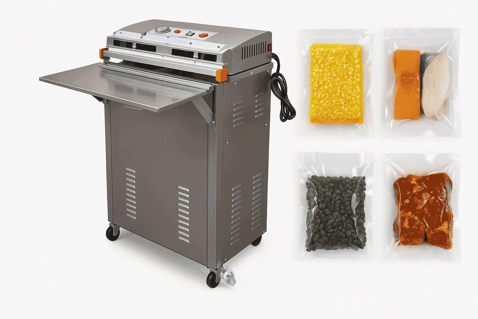 Máy hút chân không này không phụ thuộc vào kích thước sản phẩm, không bị giới hạn bởi buồng hút chân không, vì vậy máy được sử dụng để hút những loại mặt hàng có kích thước lớn.