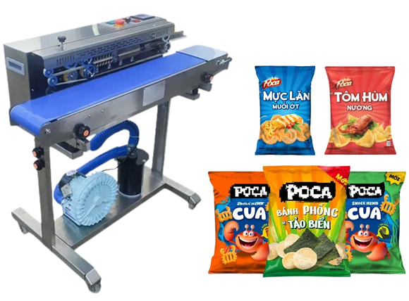 Động cơ công suất 750W vận hành khe ép. Chỉ cần cho miệng túi vào khe hàn, túi sản phẩm sẽ chạy dọc theo băng chuyền, không khí được thổi căng vào bên trong sản phẩm rồi ngay lập tức cơ chế hàn mép túi được thực hiện ngay sau đó.